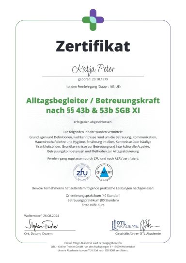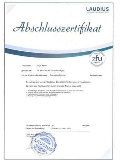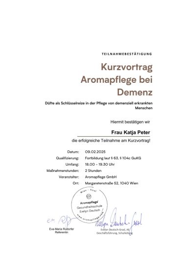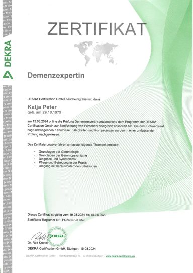 Mein Name ist Katja Peter. Ich bin verheiratet, Mutter von zwei Kindern und Hundebesitzerin. Nach meiner Ausbildung zur medizinischen Fachangestellten, habe ich wertvolle Erfahrungen in der Geriatrie gesammelt, die mein Interesse an Demenzerkrankungen geweckt haben. Aufgrund der persönlichen Betroffenheit in meinem Umfeld habe ich es mir zur Aufgabe gemacht, Menschen mit Demenzerkrankungen sowie deren Angehörige professionell zu unterstützen. Neben meiner Weiterbildung zur Aromaberaterin und Entspannungstrainerin habe ich erfolgreich die Zertifizierung zur Betreuungskraft gemäß § 53c SGB XI erlangt und mich zudem in speziellen Fortbildungsprogrammen im Bereich Demenzerkrankungen und Trauerbegleiter qualifiziert.